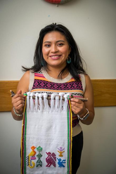 Claribel arrived in Worcester several years ago from a rural village in Guatemala. She brought with her marvelous weaving skills and now produces vividly colored bright scarf-like textiles on her back strap loom. She markets these through RAW. Claribel also stays in close contact with her younger sister back in Guatemala, who is learning to weave similar textiles. Claribel mentors her via Facetime. Claribel prefers thick cotton yarns to thinner ones -- always in the strongest, absolutely most attention-getting hues. She has recently graduated from public high school in the city; her foster family was a great support to her in her education and in her part-time jobs.