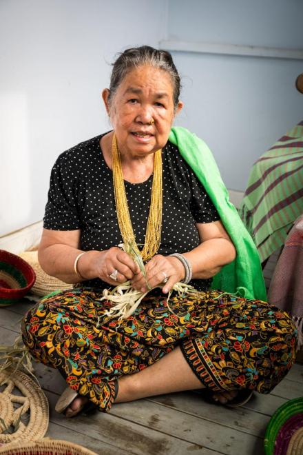 Hungma Subba, now in her 70s, experienced an uncommonly difficult journey as a refugee from Bhutan to over a decade in a refugee camp in Nepal and then on to a challenging resettlement in Worcester, some 10 years ago. As a child, her farming family and that of her husband Bhim (also an artisan) had lived and prospered to a degree in Bhutan for many years. Their forebearers had immigrated to Bhutan decades before from Nepal, in search of more land to till. They spoke Nepalese at home but saw Bhutan as their permanent home. However, in the 1990s the Bhutanese central government took an extreme nationalist and xenophobic turn and designated the Nepali-speaking Bhutanese as “outsiders” and even as non-citizens. This political situation became extremely threatening to this Nepali-speaking community and they were forced to flee Bhutan, leaving everything behind (farm, livestock, home, friends). This is the classic United Nations definition of a refugee: a person who has been forced to flee, across what are often national borders, due to direct threats of violence tied to the refugee’s political, religious, ethnic, or racial identity.