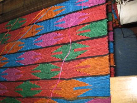 Here expert weaver Hema Bhuljal has used very standardized motifs and colors for this type of Bhutanese textiles. The cloth shows a tightly interlocking format, in bright colors. She uses a supplementary weft patterning; her motifs draw on geometric shapes such as X’s, diamond shapes, and triangles. The textile also has vertical stripes with gold thread embellishments. In the refugee camps in Nepal, the forced migrant weavers from Bhutan wove this type of textile primarily for the Nepalese market, to earn money. This sort of cloth would be cut into pieces which were then made into the national style hat for Nepalese men. This textile shown here is sold by RAW as a table runner to the American market. It is a bit narrower than the fabrics woven by Tirtha, which are also in the recognizable refugee camp craft workshop style for making the topi hats. In resettlement in Worcester, Bhutanese weavers often expand their color palette, to please their own aesthetics and perhaps also to make a cloth more sellable to customers. Hema gets her threads from Nepal, from markets there, via RAW. She prefers these shiny, brightly colored yarns to American ones.