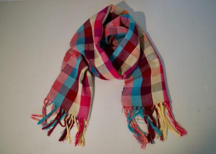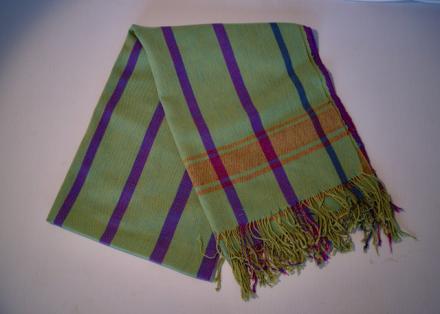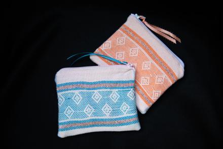 A colorful, pastel-toned cotton and metallic thread little purse or wallet, made of Hungma’s patterned cloth on her floor loom at home. She weaves in the bright sunlight there. Note how far her small creations here are from the standardized textiles the forced migrants once wove in the craft workhouses in the refugee camps in Nepal. The colors Hungma uses here were her choices; the motifs were variations on the traditional ones. Hungma is directing this cloth object toward American buying publics in a most creative way. She maintains high standards of weaving and design excellence.