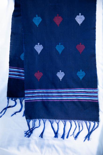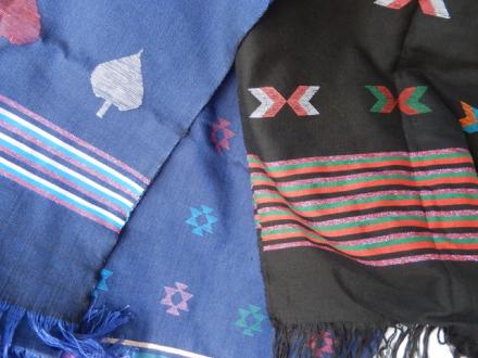 The standardized type of shawl from the Nepali-speaking Bhutanese community was often commissioned by the staff in the refugee camp craft houses in Nepal as material to be cut up into smaller cloths to be made into topi, the hat that is part of the Nepali men’s national costume. Red, gray, dark blue, black: these were the standard colors for this type of cloth in the camps. However, in resettlement in Massachusetts Jahar has a much freer hand to choose colors and even major design features, such as this striking textile shows. Jahar is deeply innovative while still drawing on traditional weaving techniques and design concepts. In fact, Jahar has been recognized by the state of Massachusetts as a master weaver and crafts woman. Her textiles are archived by state folklorist Dr. Maggie Holtzberger for the University of Massachusetts-Amherst collection. Jahar’s textiles are tightly woven with precise thread counts and great symmetry. She uses supplementary weft patterning. Her weaving artistry is so excellent that many other Bhutanese weavers consult her. This particular shawl is immediately recognizable within the local Bhutanese weaving community as distinctly Jahar’s work.
