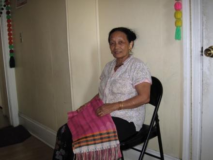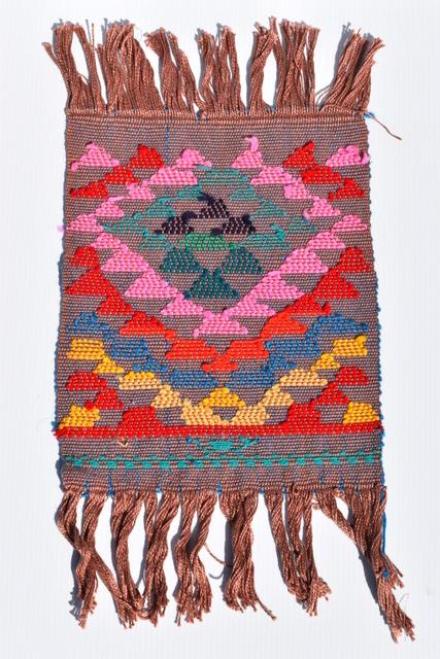 Nir has a repeated fondness for pinkish threads and plaid designs. These are both rather unorthodox choices within her weaving circles. She uses table legs for warping her loom, in collaboration with another weaver in her house, Maita. Nir employs rustic patterns and her color palette is variable, leaning often to oranges and pinks. The intricacy of her work is excellent; her motif structure is often somewhat simplified. Perhaps her fondness for plaids echoes this.