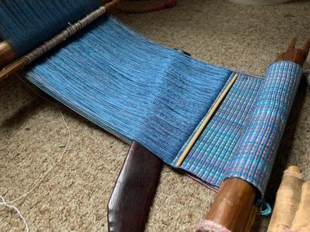 In her weaving, Tu Meh uses a circular warp with continuous heddles. She treasures her split rod tie stick, which she brought along to the US from Burma. Her textiles typically employ complementary warp pick up or complementary warp floats. Her weavings often rely on complex repetitive geometric designs (found in much Karenni textile hand manufacture). Her weavings also often include a series of stripes and her cloths are often embellished with hand-stitched embroidery. When she first moved to Massachusetts Tu Meh made shoulder bags (Lweh-eit), traditional Karenni blouses (Chikas K’Kyaw) but now she concentrates on scarves. She is pleased to be able to harvest her own bamboo at the Plymouth, MA experimental bamboo farm, to make the sticks for her back strap loom. She sets up the tension for her loom by employing heavy bags full of rice.