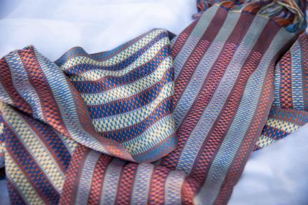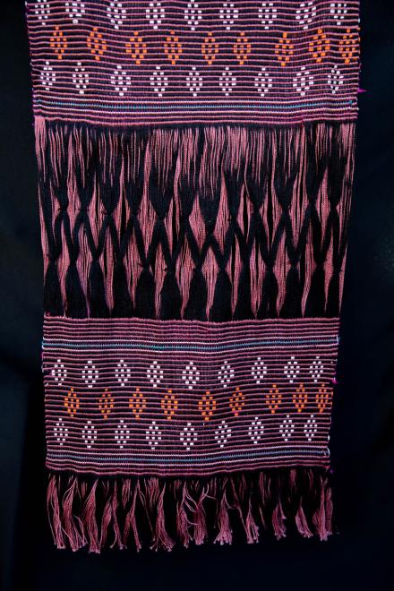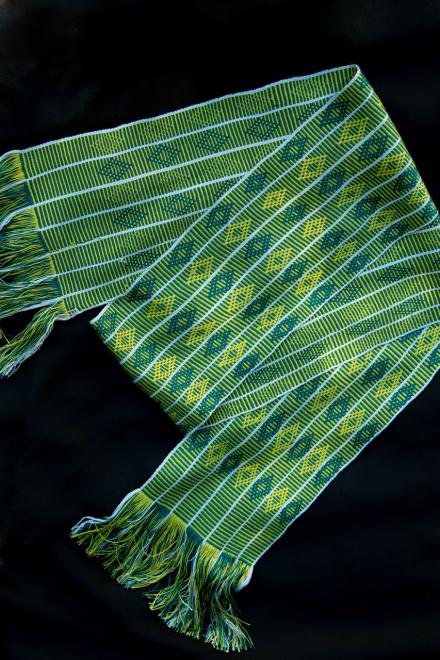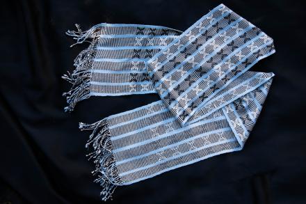 Tu Meh makes a truly large number of scarves today, most of them variations-on-a-theme of her favorite geometric designs. With RAW she started out asking for cotton thread but nowadays she is also fond of using bamboo thread, for its supple, soft qualities. Both versions sell very well to RAW customers. One time in 2023 at a weaving convention hosted by a local university, participants bought many dozens of her scraves.