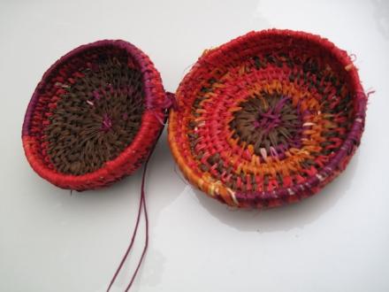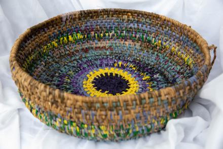 Nepali-speaking Bhutanese now living in resettlement in Worcester make a wide and wonderful variety of open-work and closed work woven baskets. In Bhutan these were made for household and farm uses, as containers with a decorative flair. But, the type has gone through many new variations in resettlement times in Massachusetts. Some tiny baskets have a RAW origin and heritage: as purely decorative, festive objects for sale. Those often use bright, pastel colors, making these items resemble miniature Easter baskets of Americana fame. The artisan Kul Maya is innovative and exuberantly creative in fashioning these small baskets.