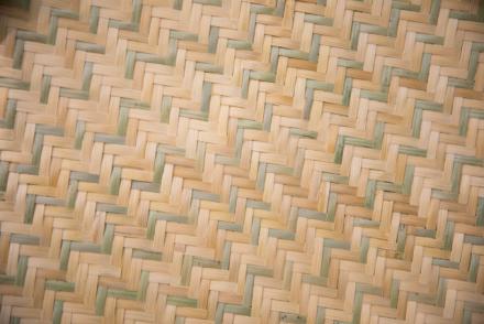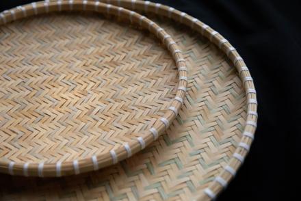 In rice growing regions throughout rural Asia, one of the indispensable steps in preparing rice grains to cook and eat is to place the raw grains (dried for hours on mats in the hot, bright sunlight) in a woven winnowing tray and bounce that tray up and down vigorously to shake the grain casings off. Different ethnic societies have slightly different tray styles but all have a very consistent shape: a round, flat appearance with slightly raised edges. The Bhutanese style calls for an especially tight weave, which male plaiters take great pride in. Bhim Subba is well known in the Worcester Bhutanese artisan community for his painstaking work in cutting bamboo strips into precisely well-hewn measures. He sits cross-legged out in his sun porch to do this; he also uses that same technique of making carefully crafted bamboo strips in his basketry work.
